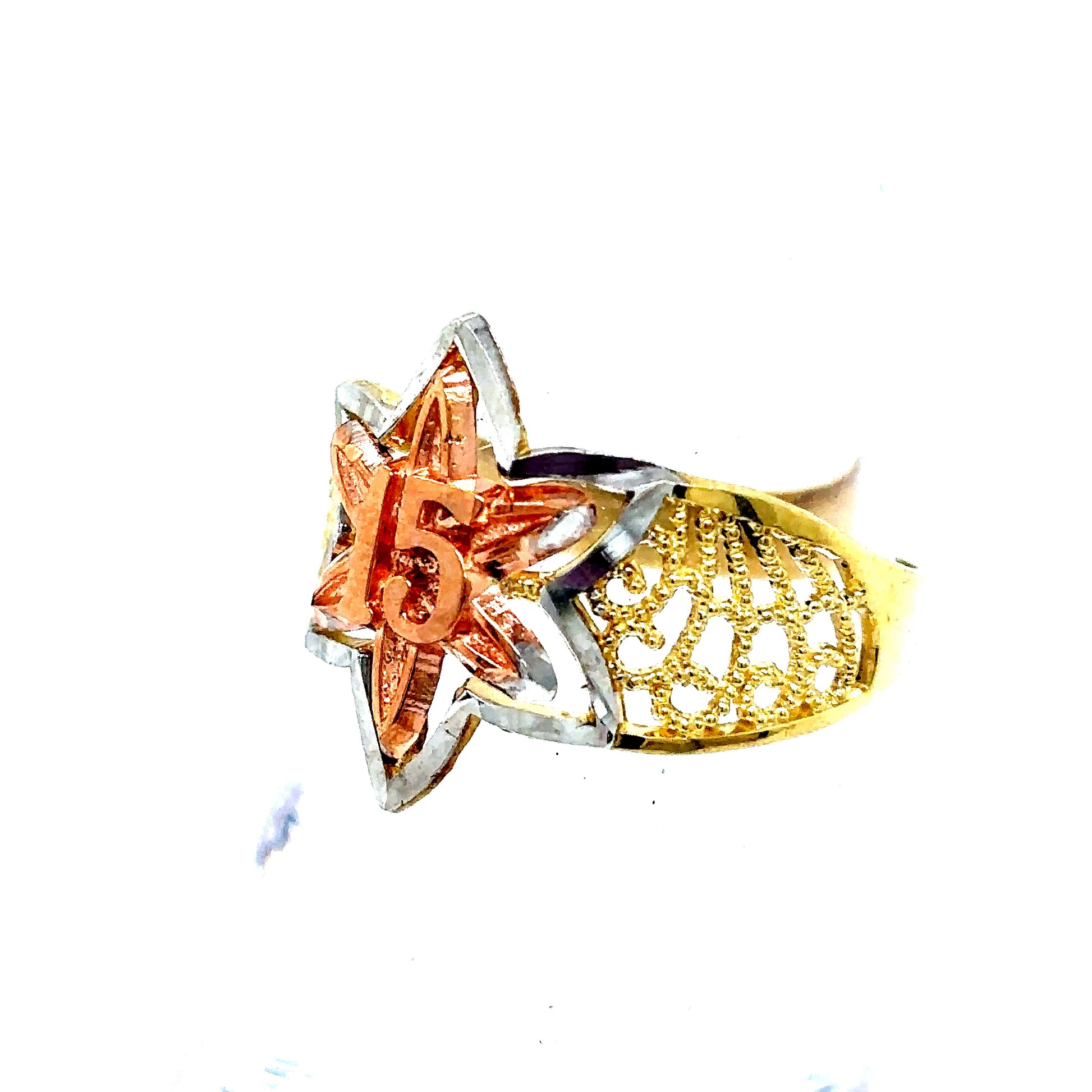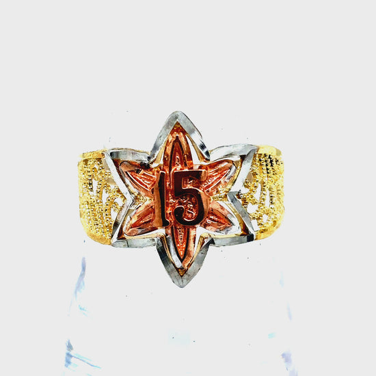 Solid 10 Karat Tri-Tone. Yellow, White and Rose Gold Star Quinceanera 15th Birthday Ring.
