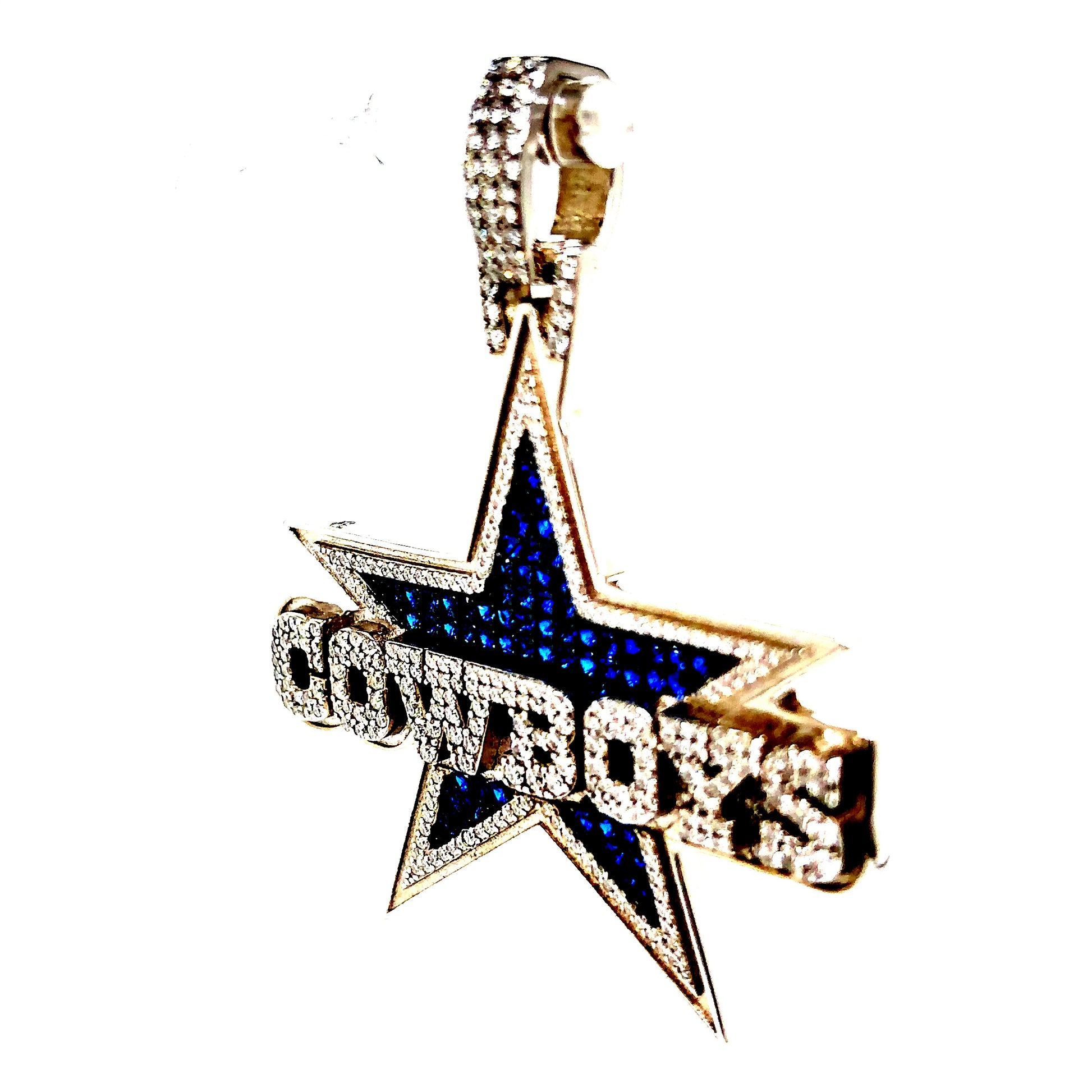 Solid 925 Sterling Silver Blue Cowboys Star Pendant with Round VVS Moissanite Stones.