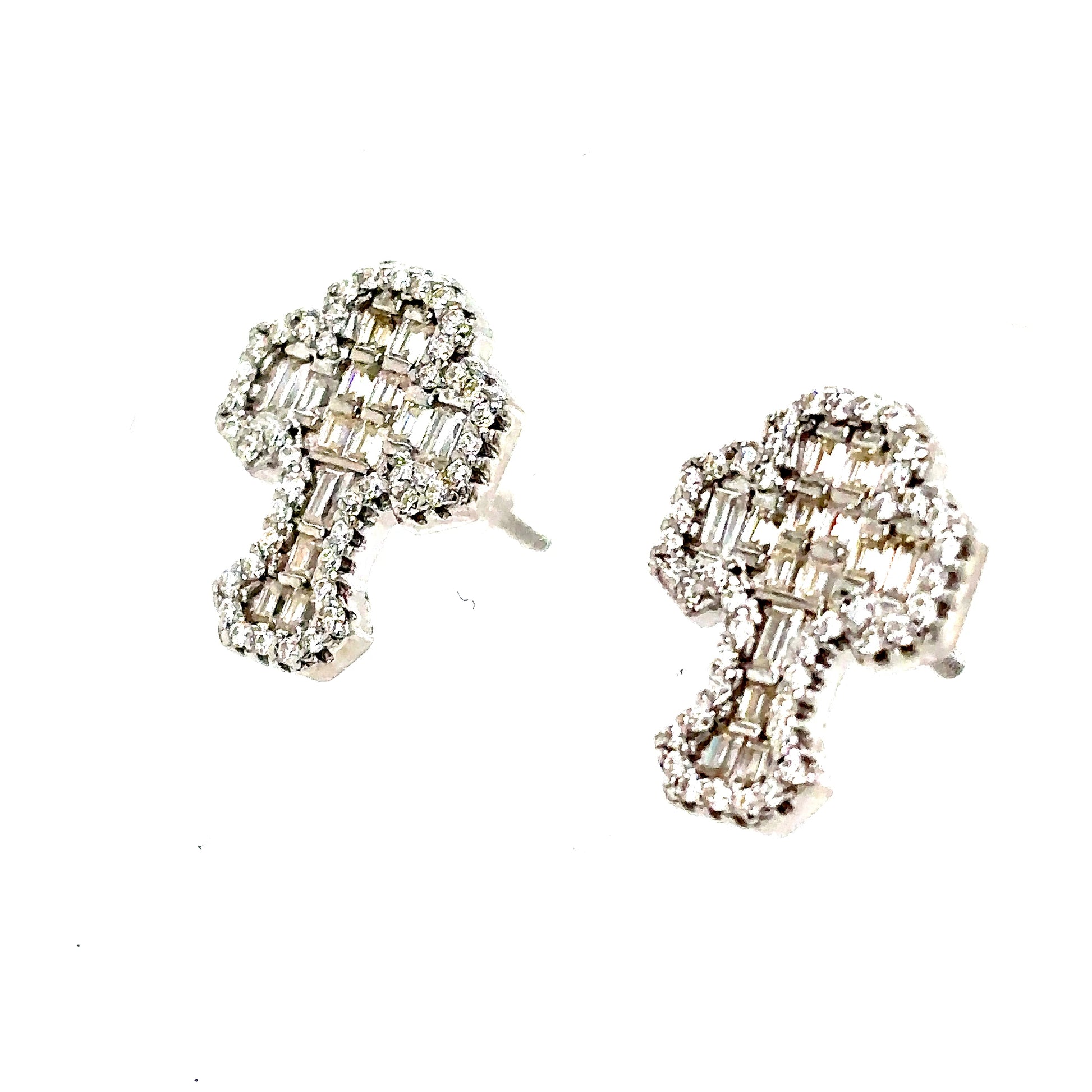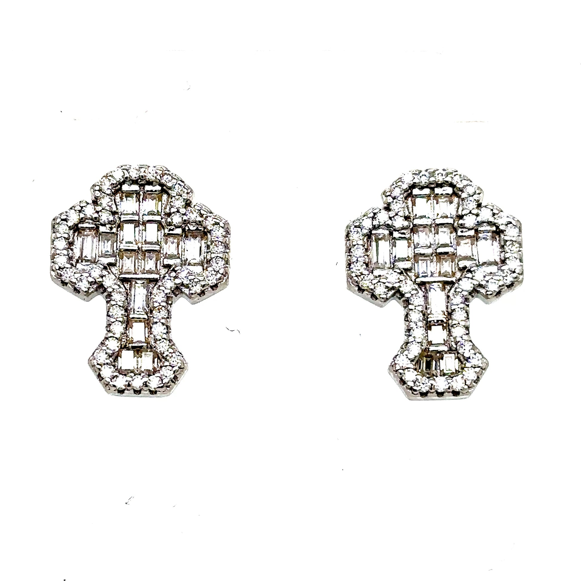 Solid 925 Sterling Silver Cross Style prong set earrings with Baguette and Round VVS GRA Certified Moissanite stones.