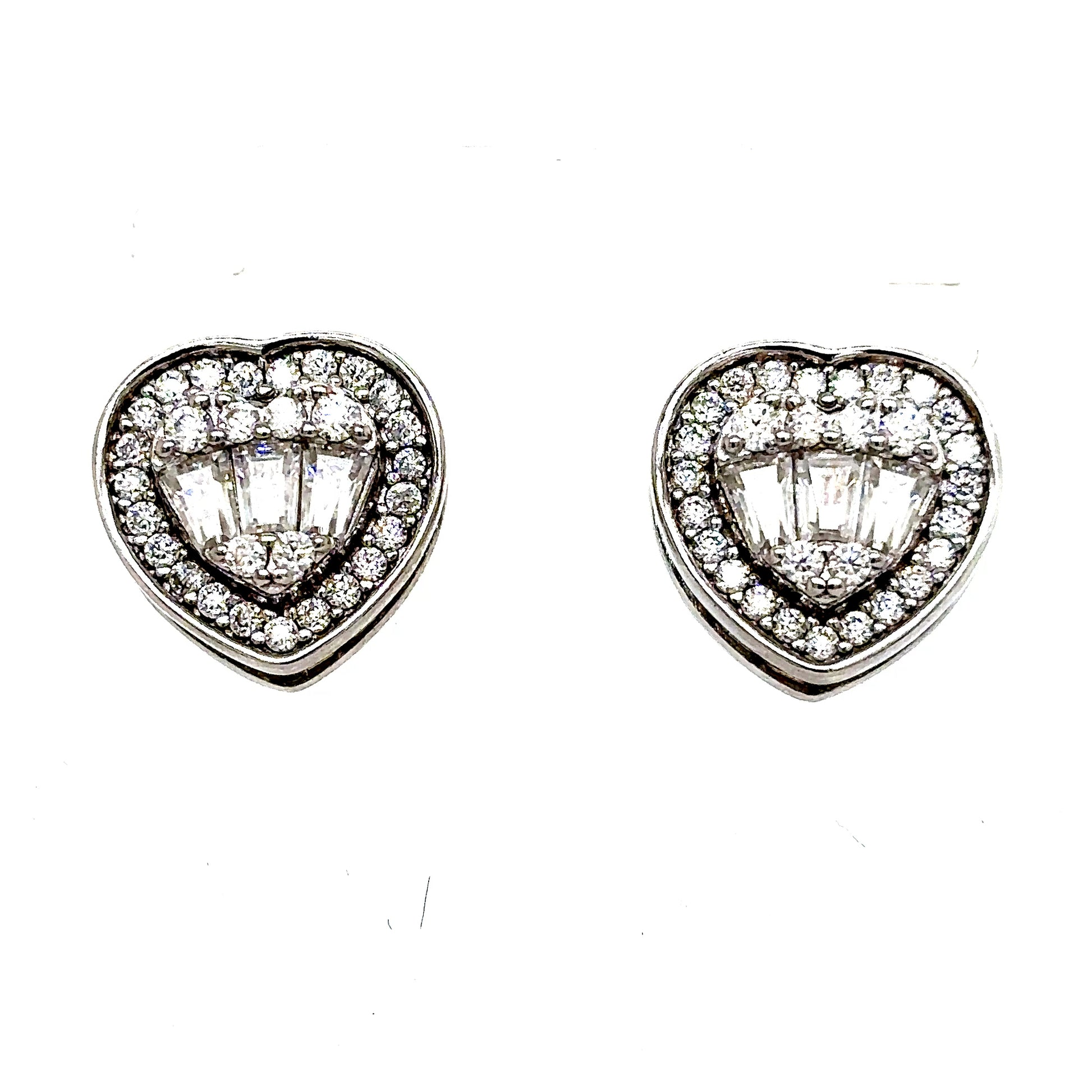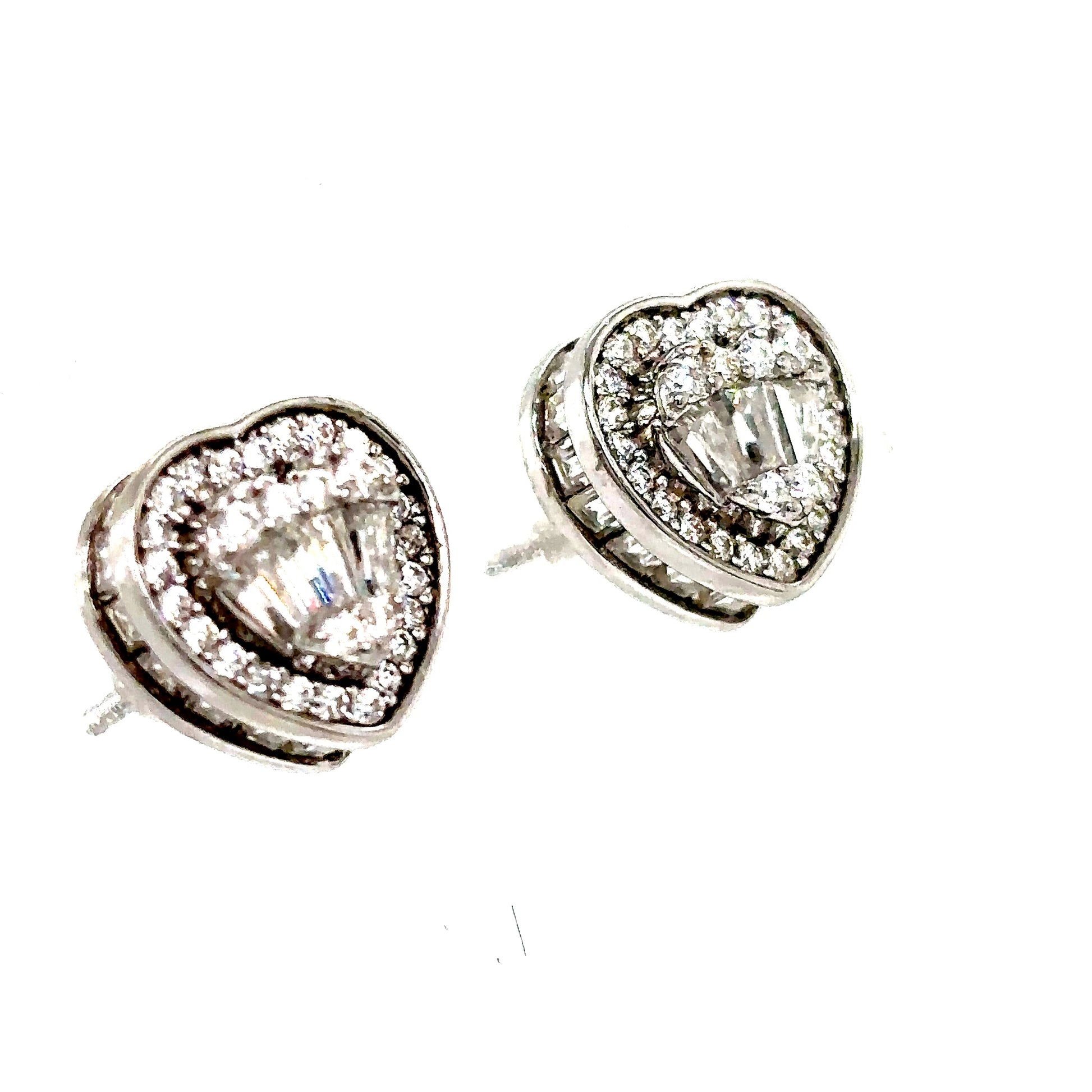 Solid 925 Sterling Silver Trimmed Heart Style prong set earrings with Baguette and Round VVS GRA Certified Moissanite stones.