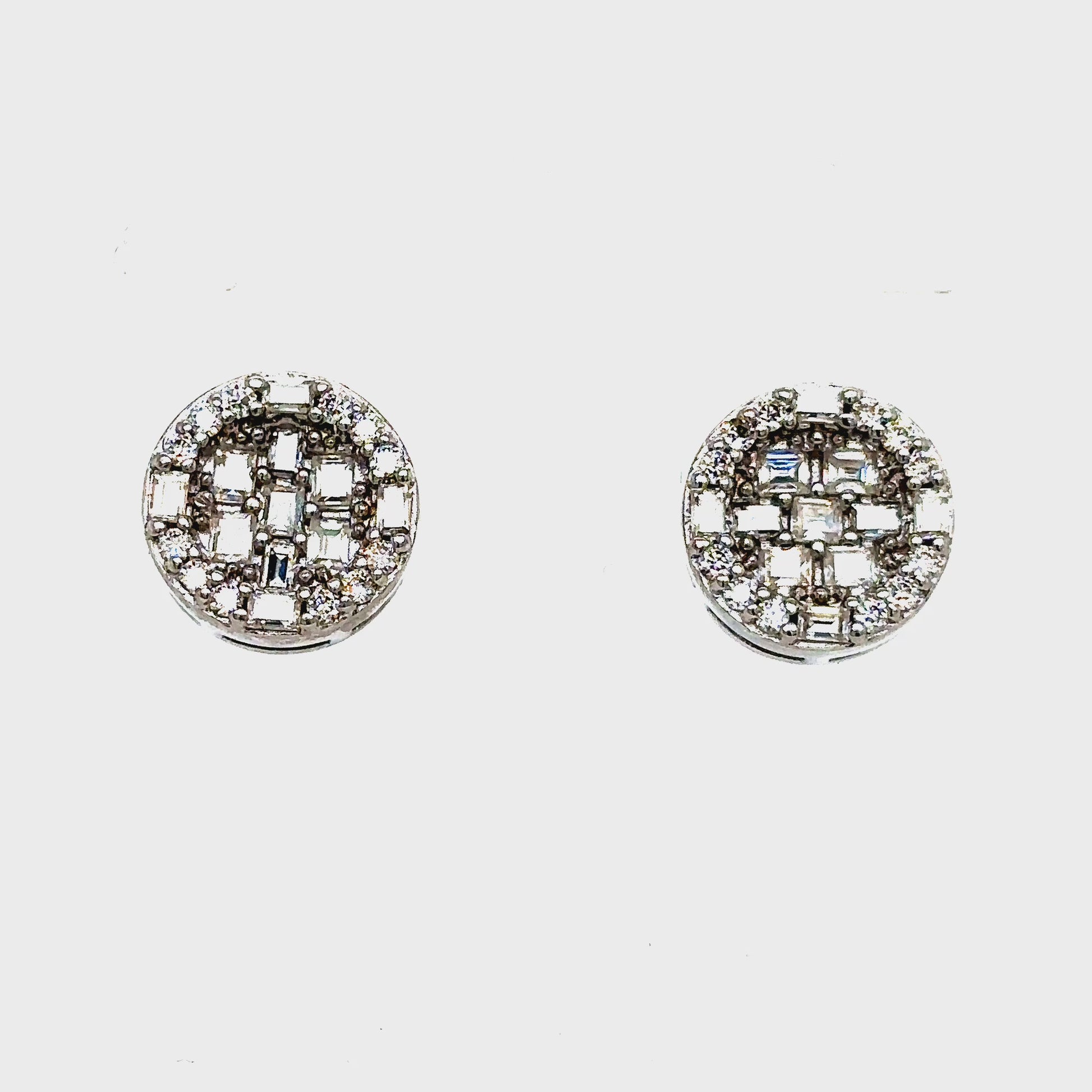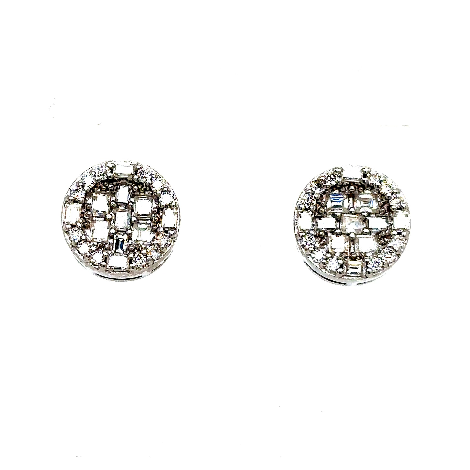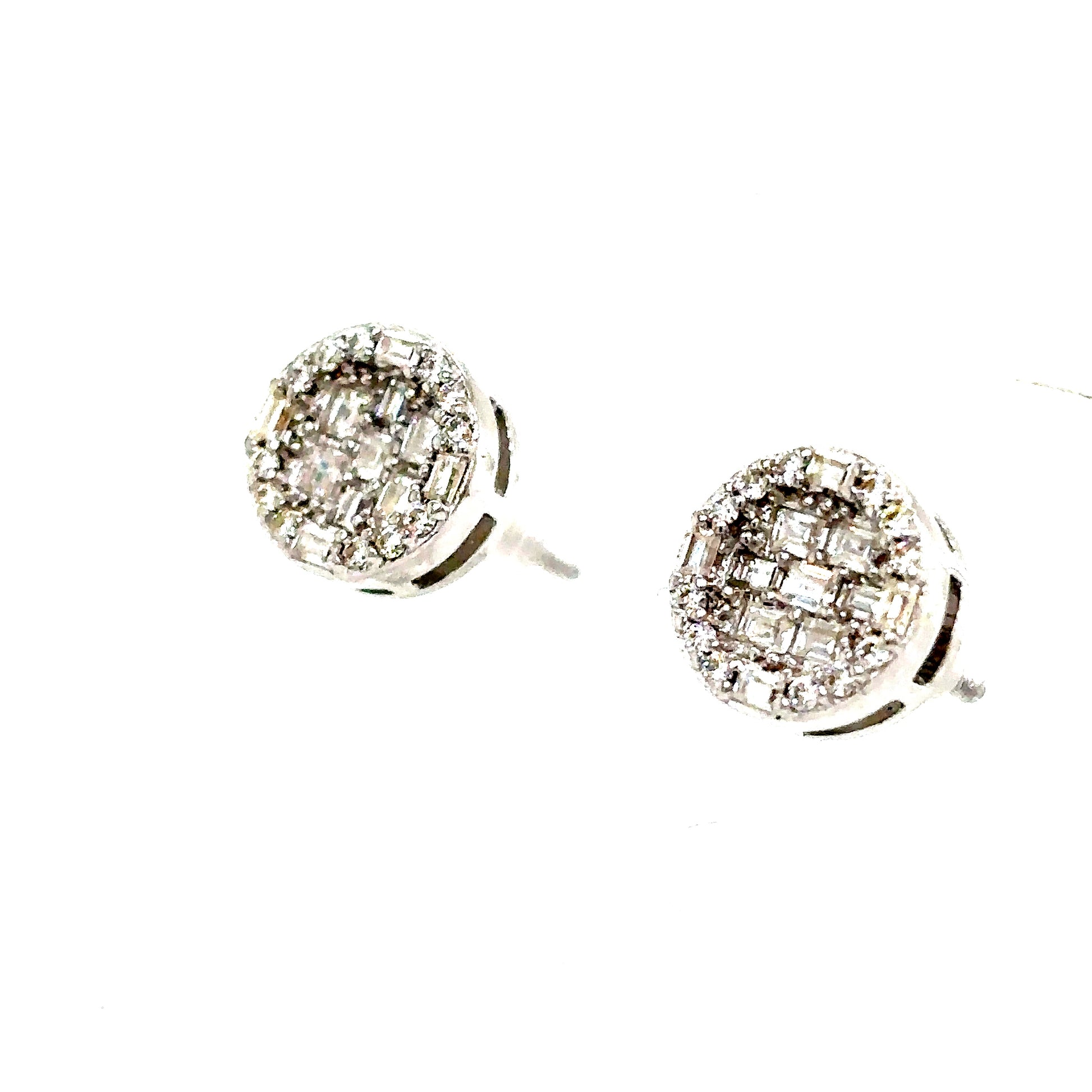 Solid 925 Sterling Silver Round Style prong set earrings with Baguette and Round VVS GRA Certified Moissanite stones.