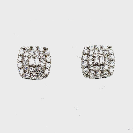 Solid 925 Sterling Silver Square Style prong set earrings with Baguette and Round VVS GRA Certified Moissanite stones.