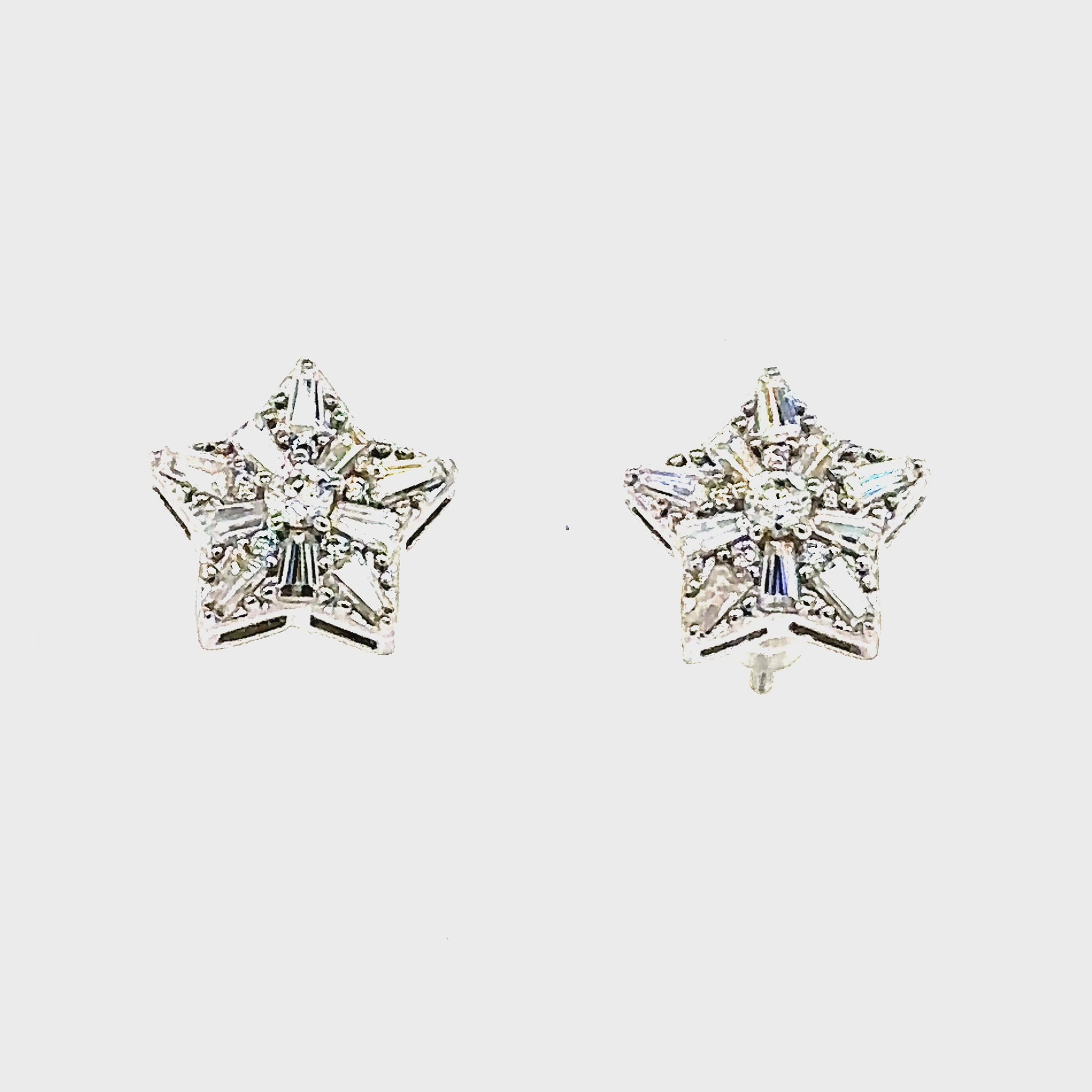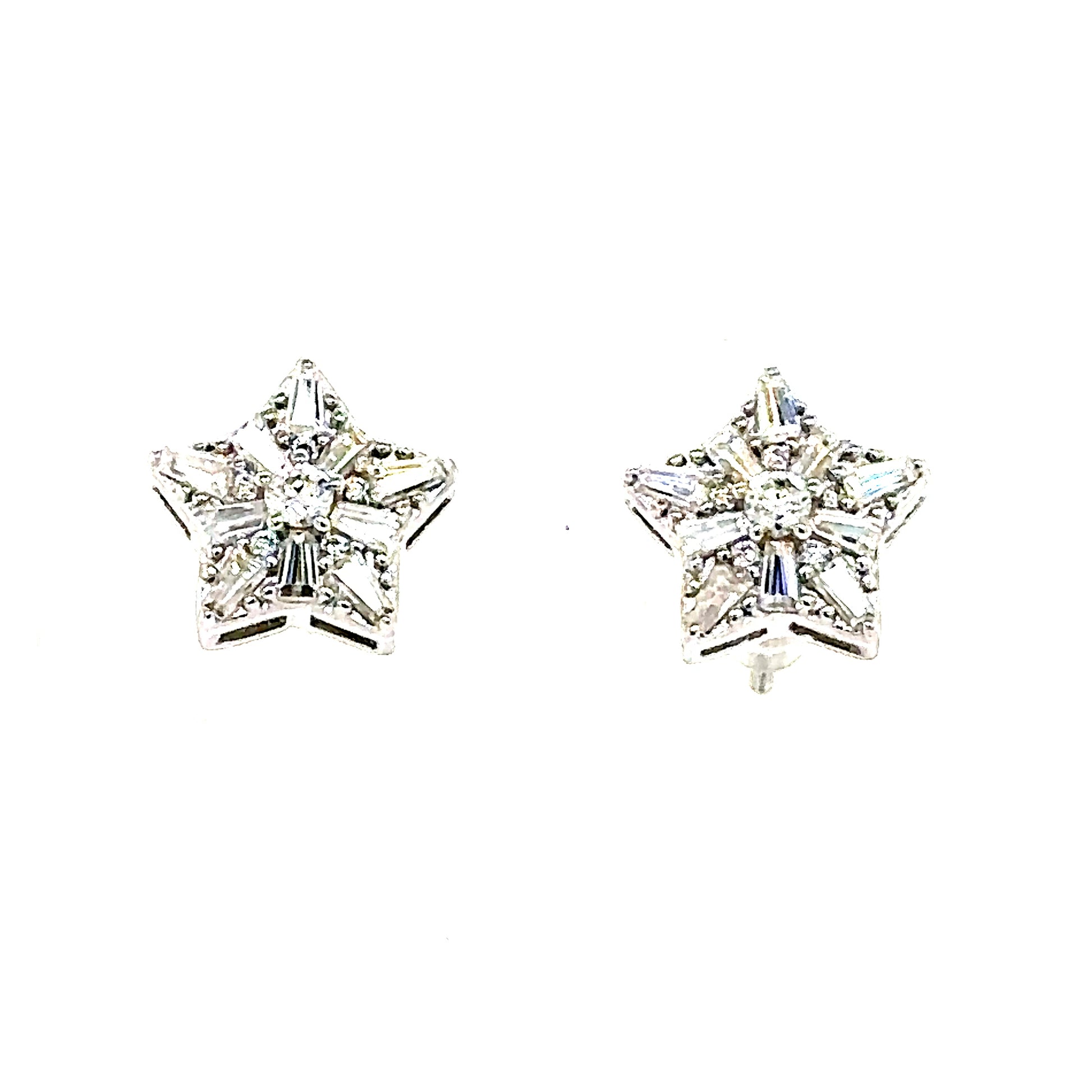 Solid 925 Sterling Silver Star Shaped Style prong set earrings with Round VVS GRA Certified Moissanite stones.